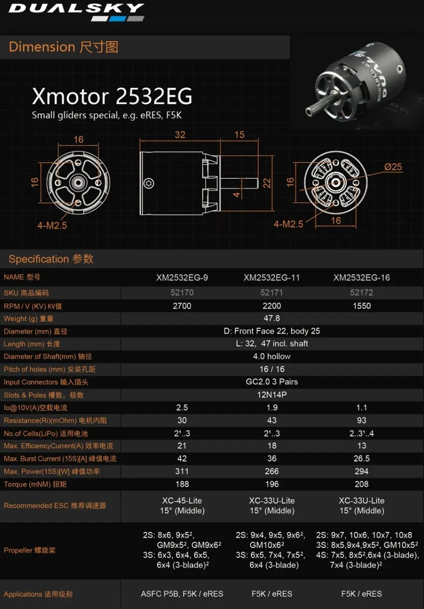 The Dualsky XM2532EG-11 is a high quality cased outrunner with a Kv of 2200 RMP/V for models weighing 350 – 800g.