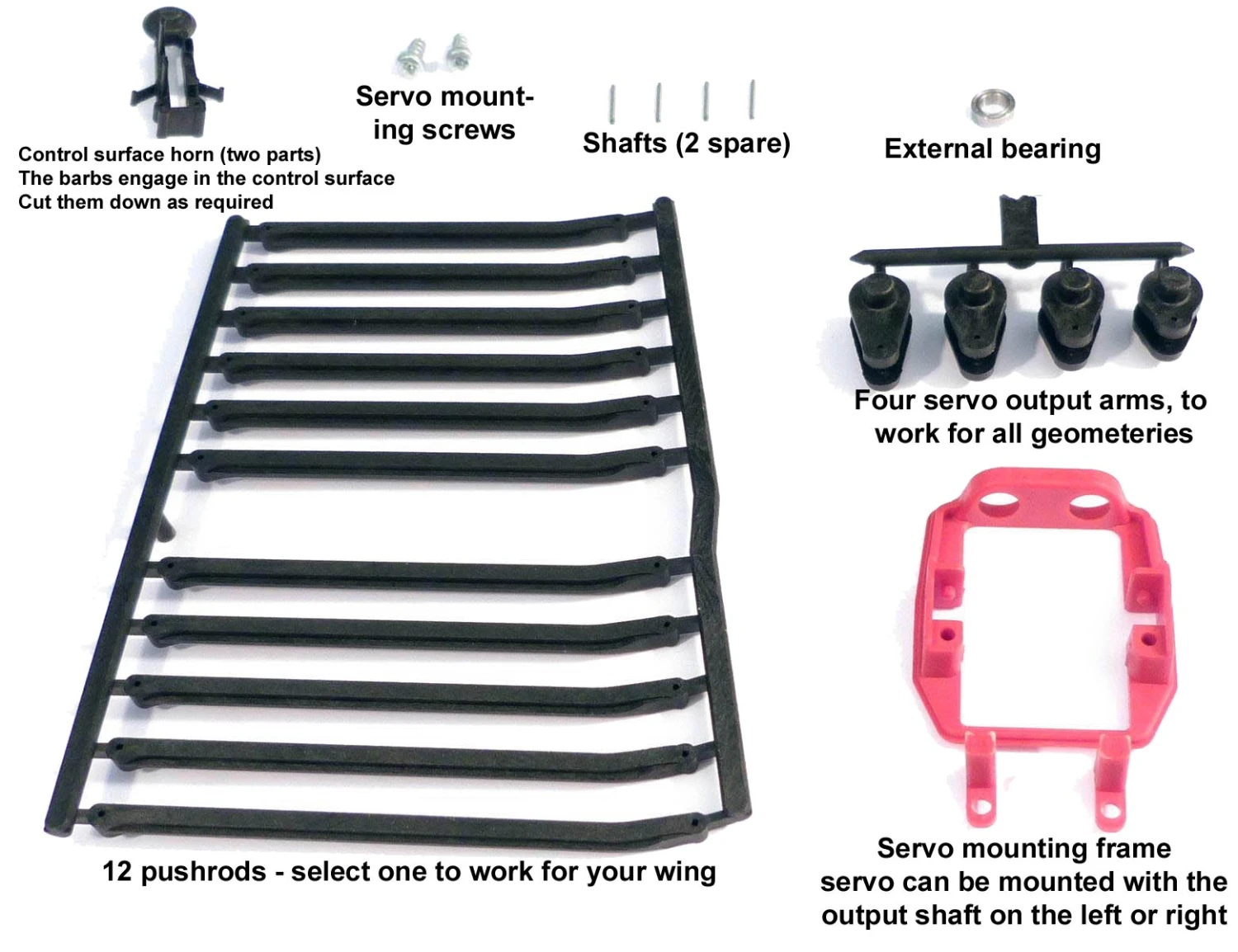 The connection between the servo and control surface is made via a ready-made hard plastic pushrod, so no cutting or gluing is required, making for a quicker and more repeatable installation. 11 of these mono pushrods are supplied in each kit, varying in length between 62 mm and 80 mm, each approx 1.8 mm longer than the next. These new IDS sets are labelled “Mono” as the pushrod is a monolithic component, not an assembly of parts that can come apart.